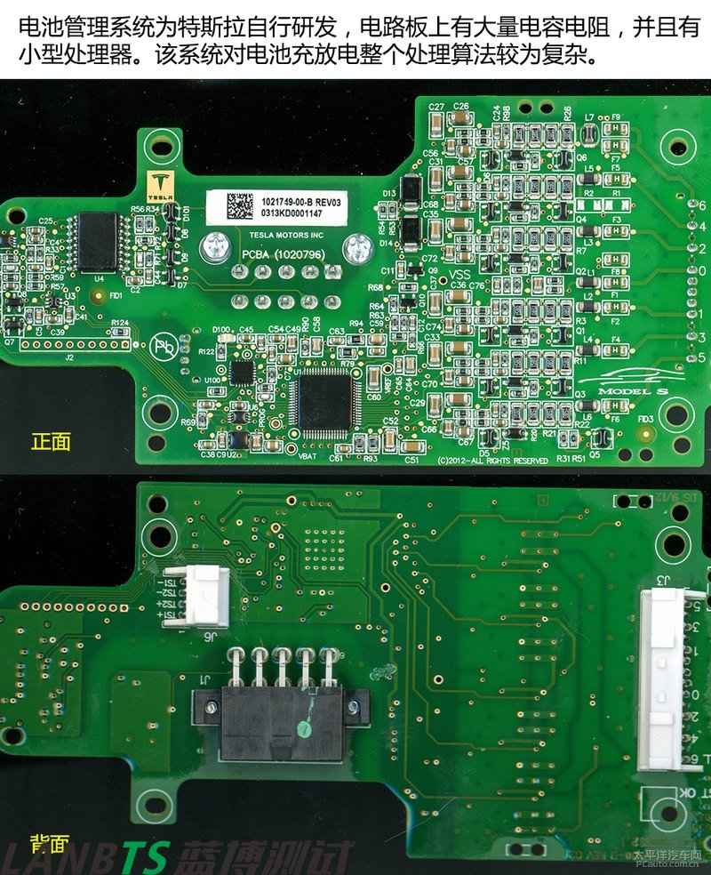 電池管理系統(tǒng)主要功能包括數(shù)據(jù)采集、電池狀態(tài)計算、能量管理、熱管理、安全管理、均衡控制和通信功能等。從電路圖上可看到,電池管理系統(tǒng)為特斯拉自行研發(fā),擁有高度的知識產(chǎn)權(quán)的核心技術(shù)。該系統(tǒng)能自行處理充放電以及發(fā)熱問題。相信國內(nèi)廠商較難山寨出來。